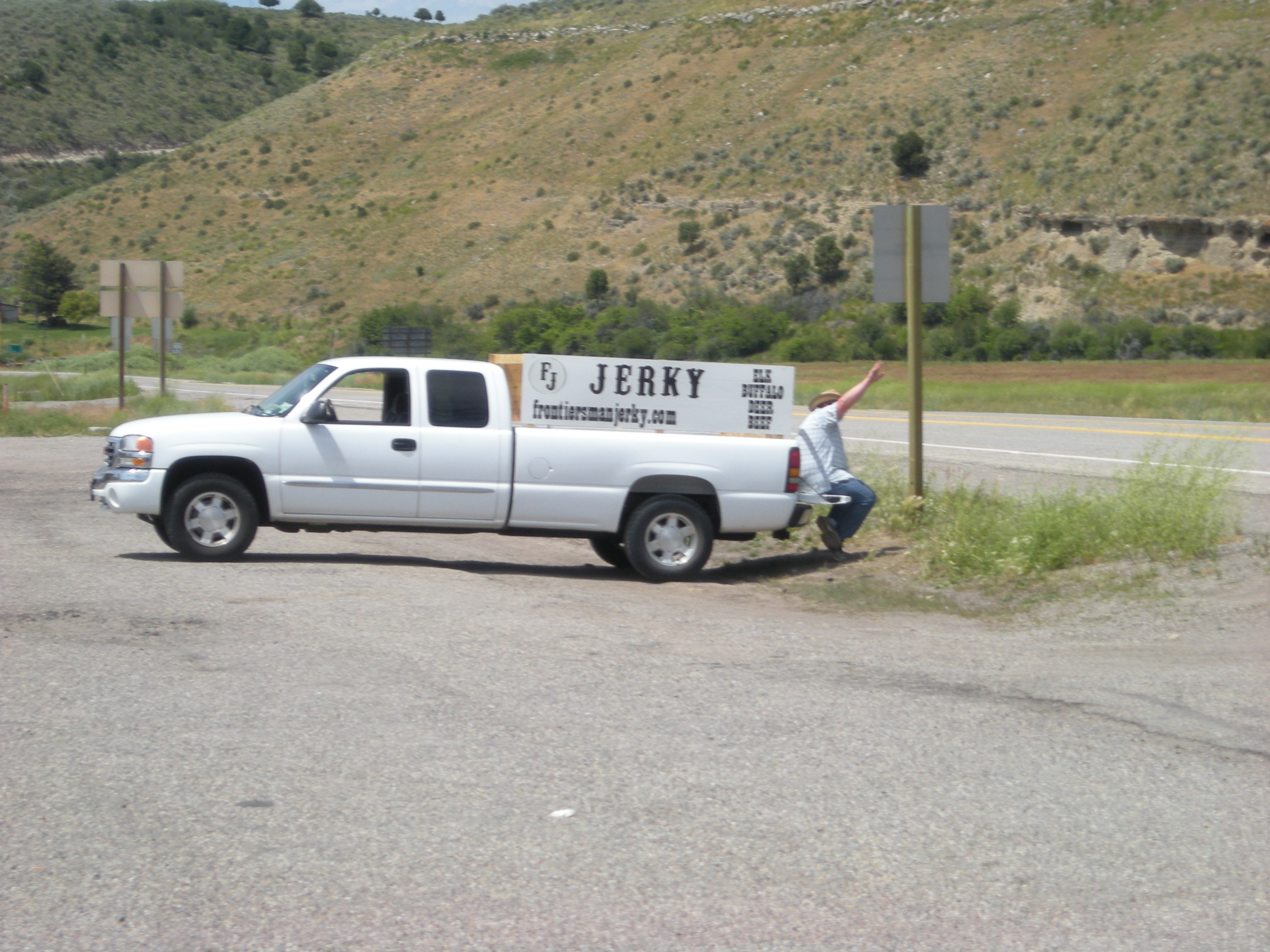 The day’s ride was short enough that I was a little concerned we were going to get to the motel before check-in time. Even though we weren’t really hungry, we stopped at the Angus Restaurant in Swan Valley, ID. The food was average but the company was great. I love travelling with my wife and friends. As we finished eating I noticed that a guy had backed his pickup truck in next to the road and had signs on it saying that he was selling jerky (elk, deer, beef, buffalo). I thought it was funny so I had to talk to the guy. His name is Brian and he makes the jerky himself from a family recipe. No he does not shoot the game himself. Anyway, after the conversation I felt obligated to buy some jerky (elk). He gave me a card and said he would ship jerky anywhere. Must be good stuff if people are having it shipped to them.