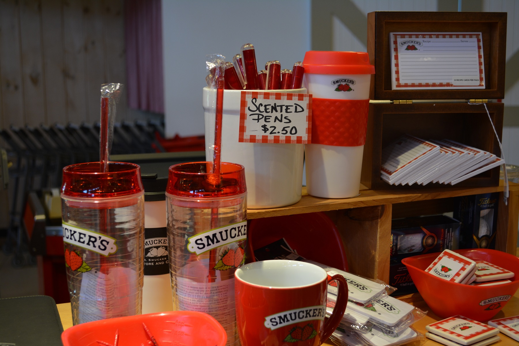 We had hit US 30 which turned out to be just like an interstate highway – 70 MPH limits and trucks everywhere. Not my favorite type of route but we made quick work of the miles today. I was really in need of some liquid so I punched up cafe’s and diners on the trusty GPS. One of them caught my eye and it wasn’t far off our route. We pulled in to what turned out to be the home of Smucker’s jelly (and lots of other brands now). This is exactly the kind of place I love to stop – not exactly a tourist trap and weird enough to be interesting. The first hat pin (or lapel pin if you prefer) of the trip was purchased. Coffee was consumed (they had a wall of Folger’s brand). A couple of pictures for memories were taken.