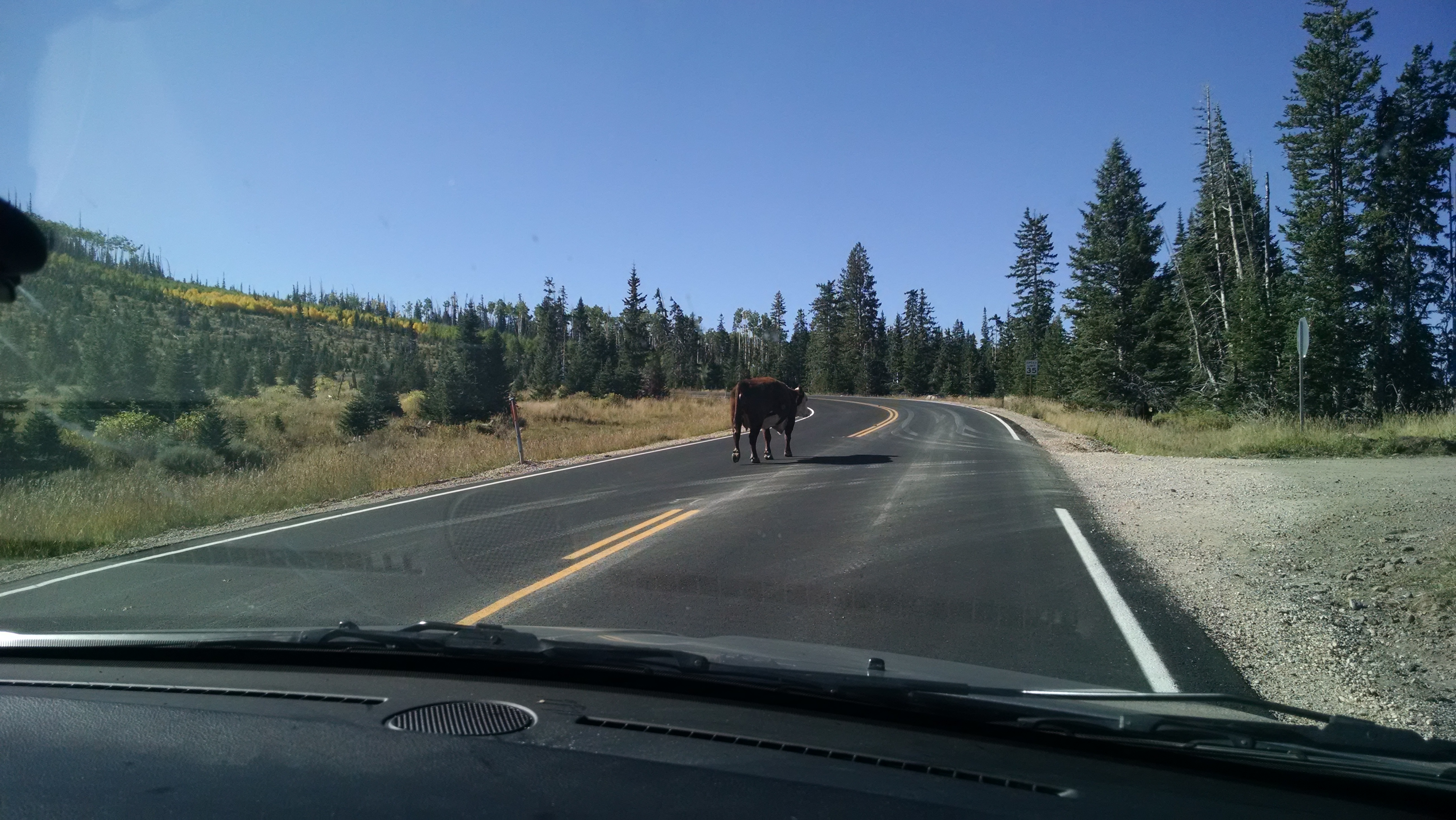 Leaving Brian Head the road climbs to almost 11,000 feet. This was a pretty good challenge for the Queen Mary Express (Dodge minivan) that we are piloting. It was pretty embarrassing to get passed by a cow! If you don’t believe that – see the picture below.