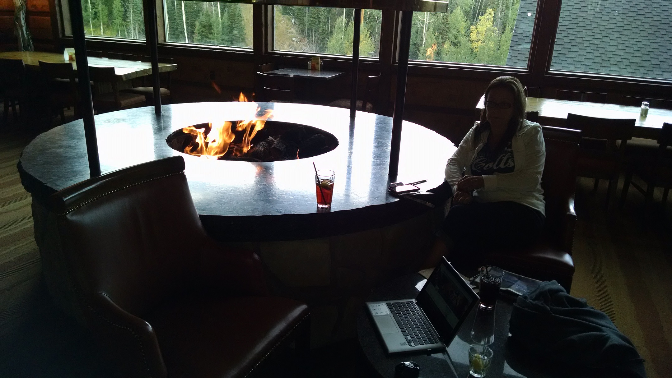 There was no blog post yesterday. We went exactly zero miles. We stayed in and listened to the disaster that was the Indy Colts first game of the year. We sat in the bar here at the lodge and listened to Bob Lamey using my laptop. I did manage to get a picture of the lodge that I promised before. I also included one of our set-up in the lounge for the Colts game (not bad surroundings).