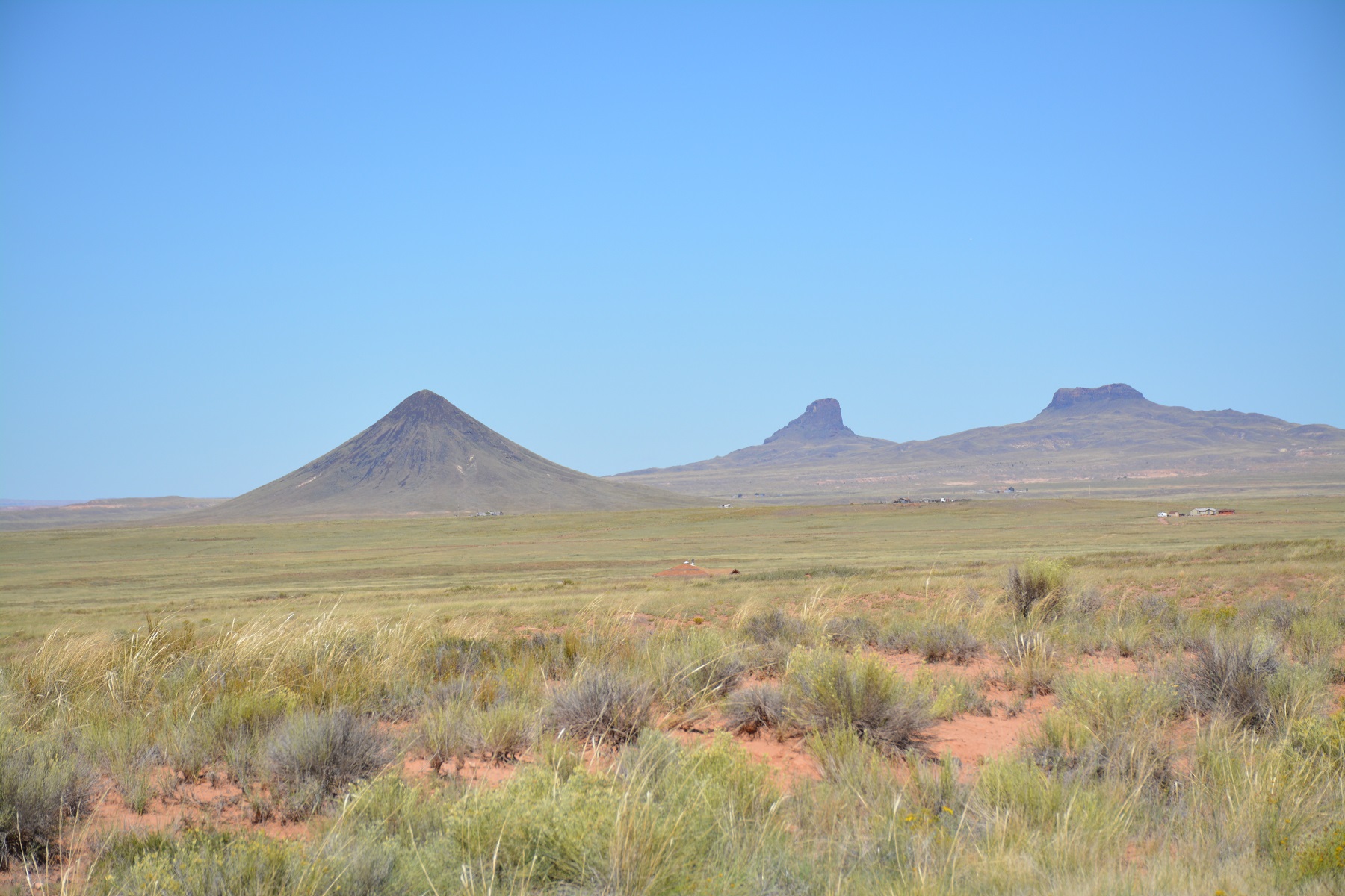 We left Winslow via AZ-87. It looked like a good northerly route that avoided retracing scenery from previous days ramblings. It turned out to be 62 miles of Arizona high desert. After 57 miles there was a left hand curve in the road. It was one of the longest straight line drives I’ve ever made. In the distance there were glimpses of the painted desert but mostly just occasional hills of various shapes. I included a representative picture below.