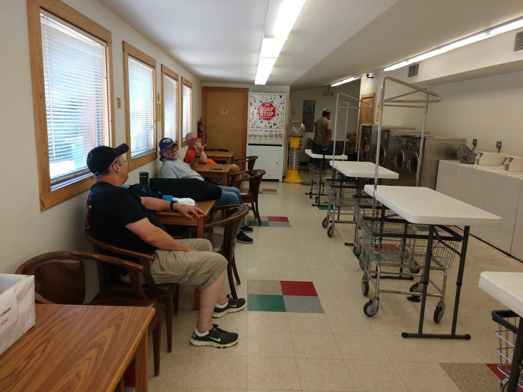 The final image of the day is one of the necessary evils of the trip. Our intrepid group doing their duty in the laundromat. There is no limit to how much fun we can have.