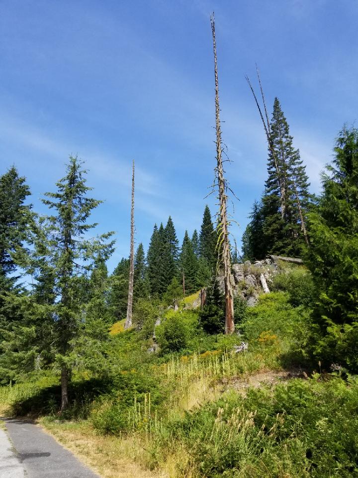 After the 25 minute delay mentioned earlier, we were rolling on very dusty, very loose gravel following a parade of log trucks and passenger cars. Did I mention that it was hot?