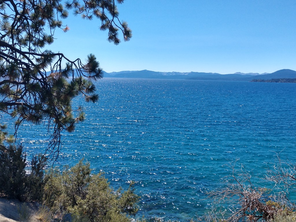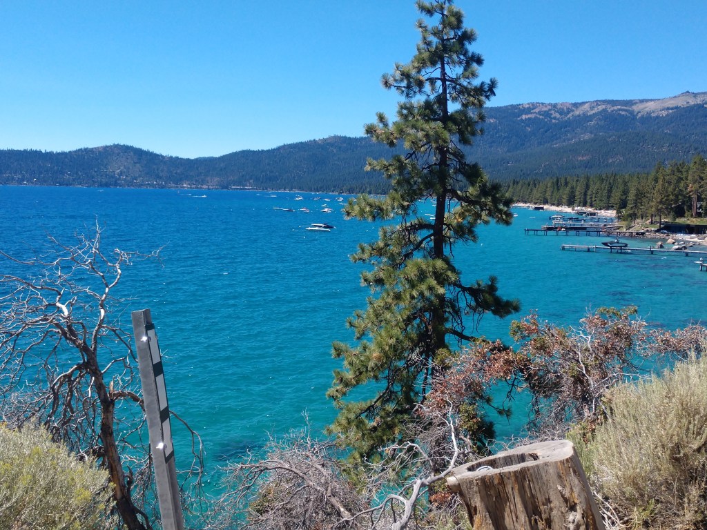With the bikes full of gas and our snacks consumed we tried to get a glimpse of Lake Tahoe. A few miles down the road we found a convenient pull-off that offered a great view of the turquoise blue waters.