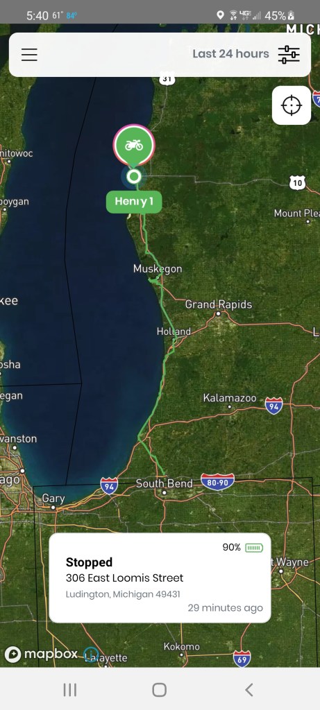 Laying in the hotel room last night at Niles, Michigan I was hoping that my untested saddlebags were somewhat water proof. It really poured down and we went to sleep to the sounds of thunder and lightning. I am trying out a new GPS tracker on this trip and got an alert that said the bike had been tilted. During a heavy storm (including tornado watches) that can be disconcerting. I ran downstairs and all was well. Maybe that tracker is a little too sensitive.