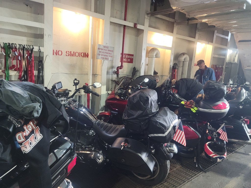 The motorcycles board almost last. They save that honor for late arrivers that have to be backed onto the boat. I must admit that I was somewhat apprehensive. I came prepared with enough tie-down straps so the bike would survive everything but capsizing. I worry too much. Boarding was breeze although the floor was somewhat uneven as they have attempted at various points in time to cover up the rail lines that are laid into the floor. We parked the bikes on iron grates and tied them securely to either steel bars in the walls or to the iron grates. I think there were 10 bikes total and only 1 couple had done this before. If you can ride your bike to get here, you will have no issues getting it loaded.