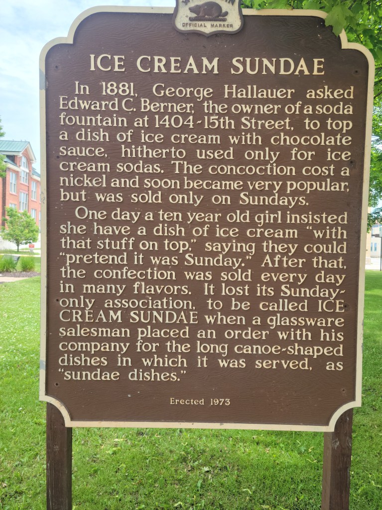 Ferry boat – check, pothole er, uh Sputnik crash site – check. What’s next. How about the place where the ice cream sundae originated. Not sure if this is the real story but there is a plaque (which is more truthful than reading it on the internet).