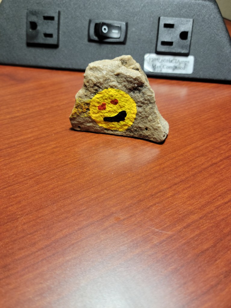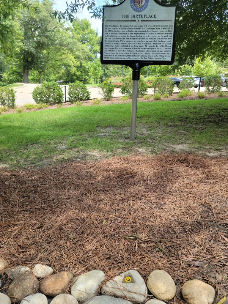 I had another mission to complete while I was on the grounds. A few weeks ago I was travelling with my son Spencer and we happened to be in Seymour, WI at the statue of Hamburger Charlie. I happened to find a rock that had been handpainted with a smiley face. (If you’re interested you can scroll back thru my blog posts for details.) The instructions on the rock stated that I could keep it or rehide it and asked that the finder (me) post info on the Seymour Thunder Rocks FaceBook page. I decided to keep it and report it’s travels until I found the appropriate place to rehide it. Today was the day. After all, what better place for a smiley faced rock than the birthplace of the King of ROCK and Roll.
