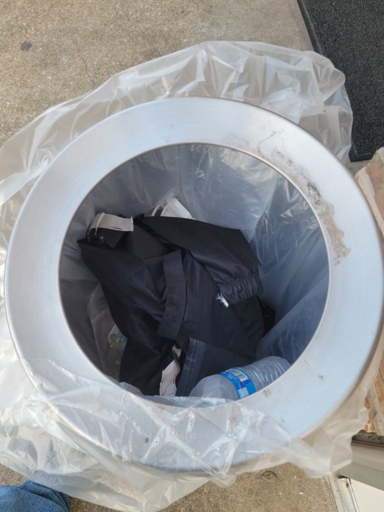 Rolling the last few miles into our hotel I smelled something plasticy (is that a word?). Yep – part of my shredded pant leg was hitting the exhaust pipe and was smoking as it slowly melted away. I was afraid to look at my bike exhaust. I thought that the rainsuit pants were getting even for all of my harsh words about them while they melted all over by bike. Fortunately, they were not successful in discoloring my bike and the pants were rewarded with a fitting end.