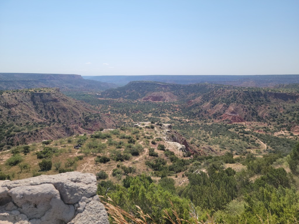 The surprising part of the canyon experience for me was that the entire area leading up to the state park is about as flat as a table top. It’s only when you are entering the park that a large canyon comes into view. We stopped exactly twice on our jaunt. Once to take the picture you see above and to walk down a short incline to the visitors center. The second stop was at the “trading post” which really more of a retail shop with food and the requisite souvenirs. I was able to score my first “smashed penny” of the trip and another hat pin to place on my map at home. We had another great conversation with a couple who was camping in the park and sat next to us while we enjoyed the air conditioning and a cold drink at the trading post.