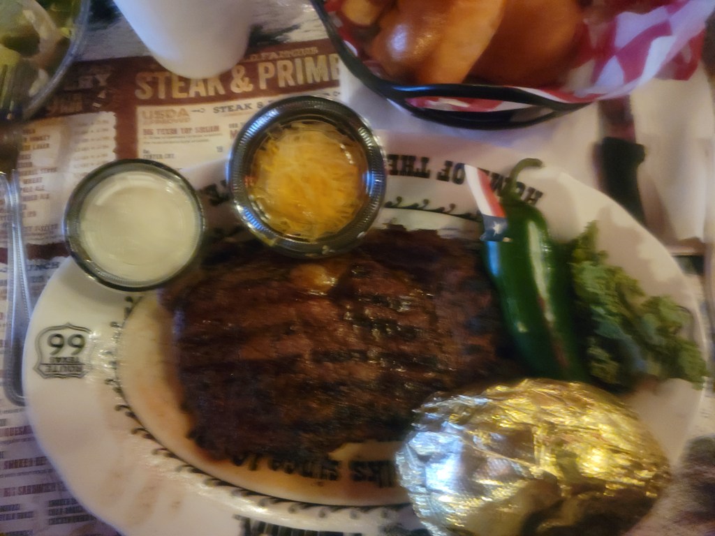 Soon enough we were back in our own air conditioning and discussing what to do about food (like I need to eat more). If you’re in Amarillo it’s hard to resist a visit to The Big Texan. Their billboards proclaim a “free” 72 ounce steak. Admittedly, there is some fine print associated with the offer (which no one ever bothers to read).