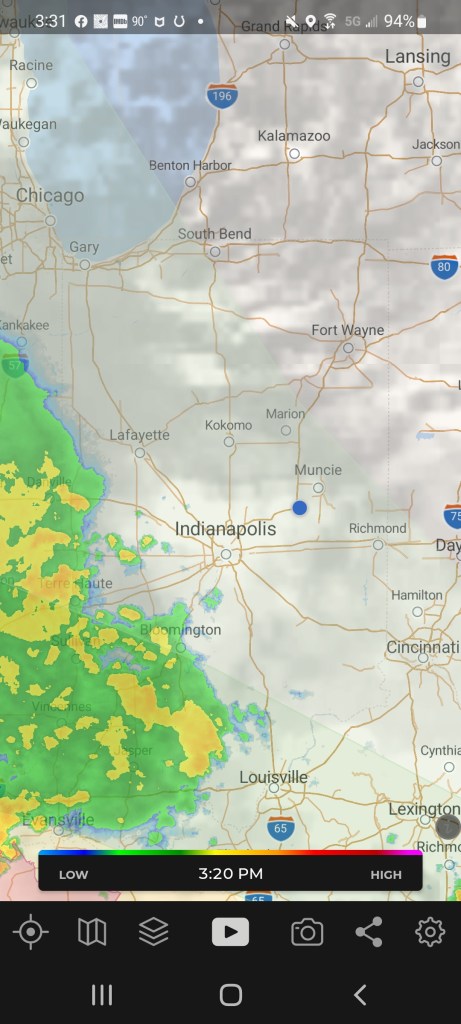 Based on the location of the storm system we thought going a little east and north on secondary roads would be a wise choice. After a short break we jumped onto US-50 trying to get to Indiana 3 which leads directly to the ranch. Guess what – Indiana 3 had road construction and we were force onto about a 20 mile detour back to the west. Ugh – Just what we needed to head due north. A very familiar highway presented itself so Indiana 9 north became the new path home.