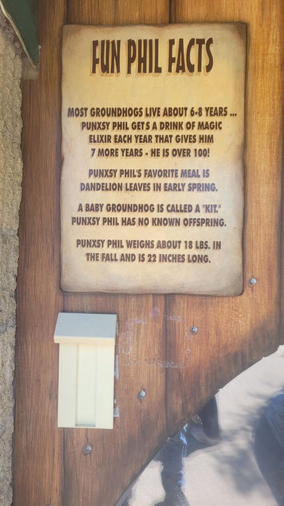 Not far from this memorial is the home of a famous rodent who is definitely the worst weather forecaster in the world. He has his own day and it turns out that he only “works” that one day a year – Groundhog Day (part of the slogan is “there is no ‘s’ in groundhog). The newsworthy event takes place on February 2 in the small town of Punxsutawney, Pennsylvania. The Groundhog is of course, Punxsutawney Phil.”
