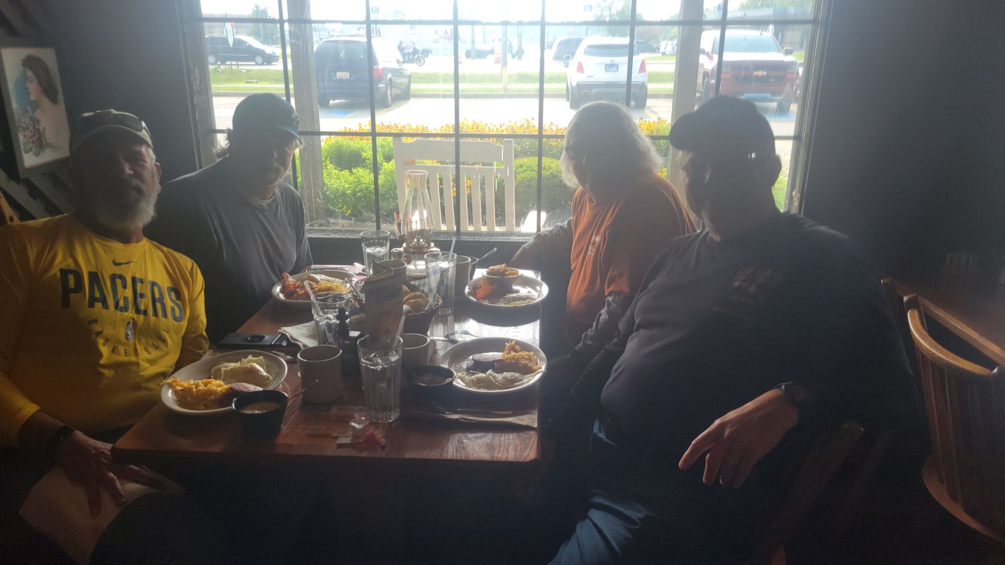 Not surprisingly, we were all right on time for breakfast. I wanted to capture the momentous occasion by getting our group’s picture taken. We should have stepped away from the window while our helpful server pressed the button. At least no one will recognize us when they use this picture to hang in the post office.