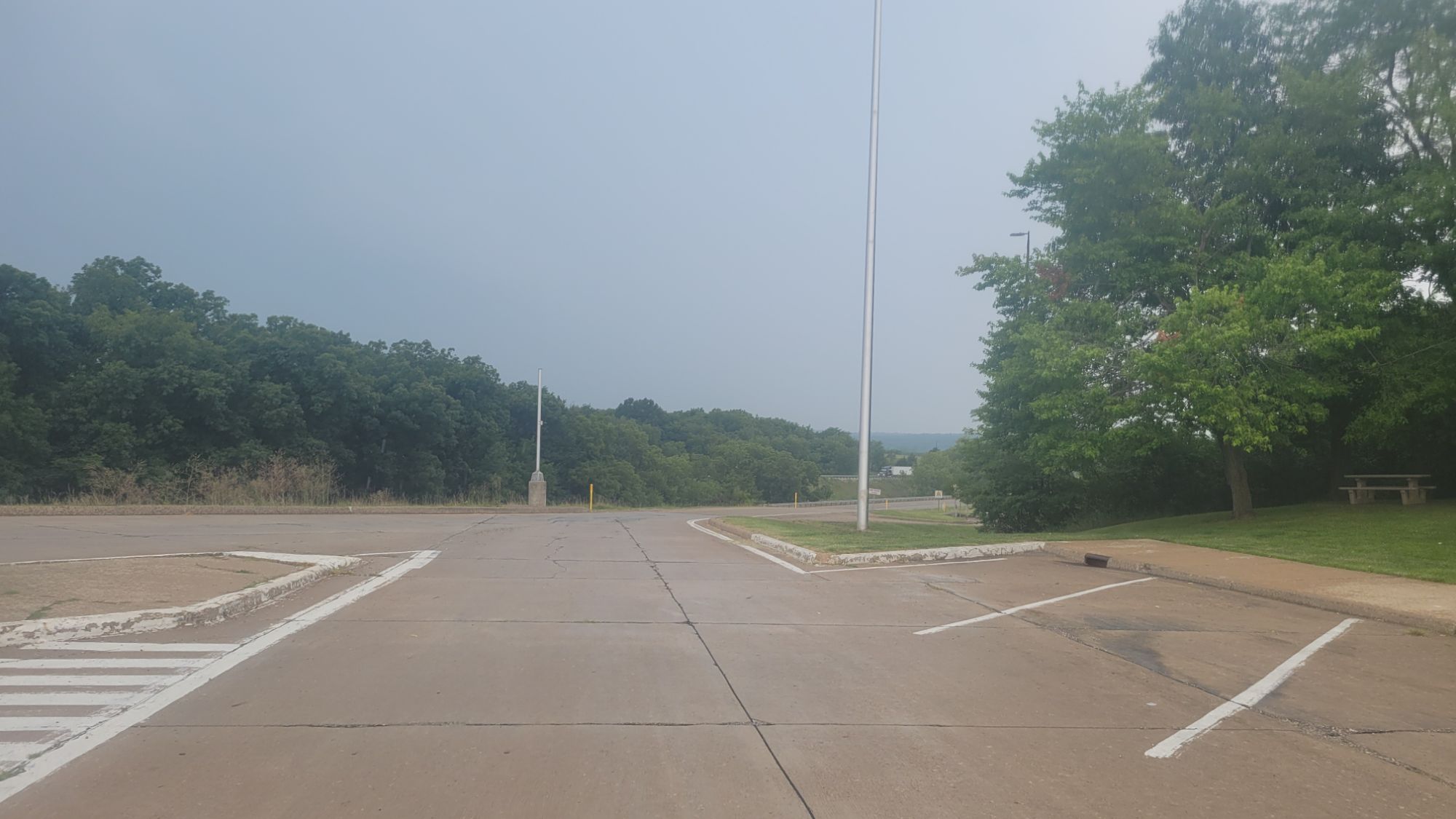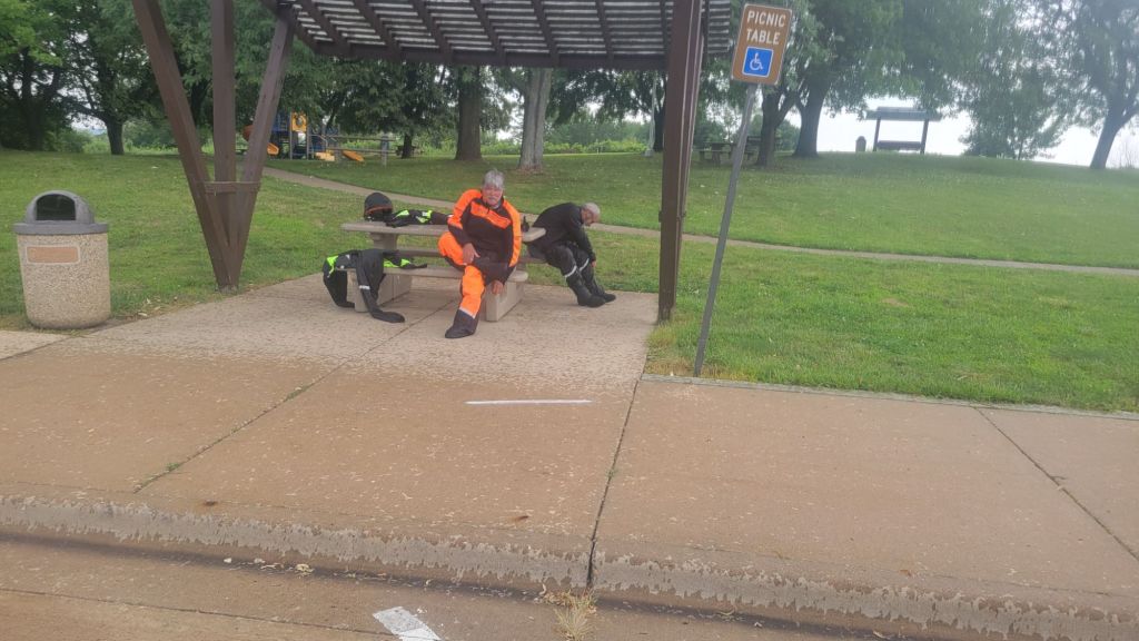 OK – lots of interstate miles but at least it wasn’t raining. Oops! Now it’s raining. Half way a cross Illinois, the thunder started followed by liquid sunshine. Out came the dreaded rubber suits. These are a real joy when the temp is in the mid 80’s (temps in degrees Fahrenheit). It can be kind of humorous watching badly out of shape me try to put on the necessary sauna suit while being careful not to sit down on anything wet or hot-enough-to-melt-plastic suits.