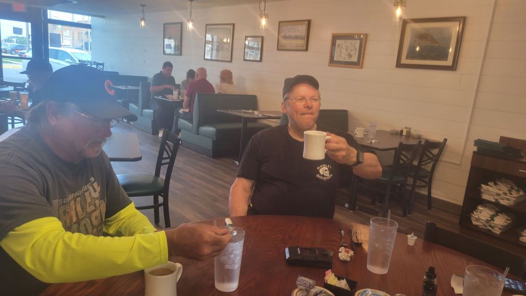 We followed the usual routine – pack the bikes, check out of the motel, and look to Mason to find a good breakfast diner. I think Mason’s batting average is about .875. I’m not sure how he does it but he very rarely leads us to a breakfast disaster. Today he chose a real winner for us. April’s Diner in downtown Newton, Iowa. I actually learned something while at April’s. Newton, Iowa is the world’s leading source of Maytag Blue Cheese. Don’t ask me any more details. I am not a cheese connoisseur. I thought Maytag made washing machines. Breakfast was good – no cheese was consumed.