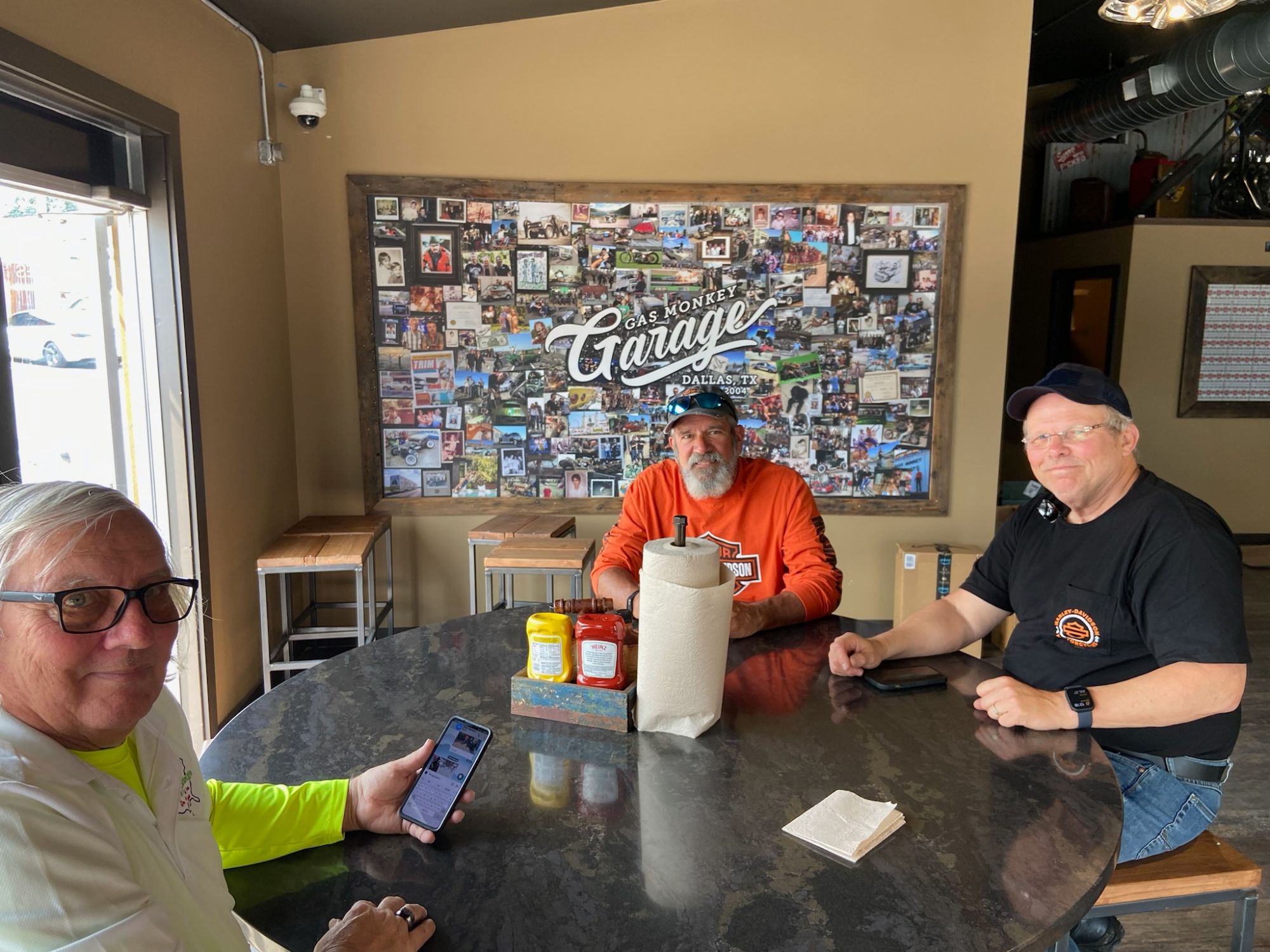 It had been a while since breakfast which consisted of the continental offering at the hotel. It was time for lunch. There is a new place across the street from the dealership – Gas Monkey Garage. We left are trusty bikes parked at the dealership and meandered across to check it out. It turned out that today was their first day of being open to the public. It was a little chaotic. The food was good but our server did not know how to split the check so we handled that chore ourselves.