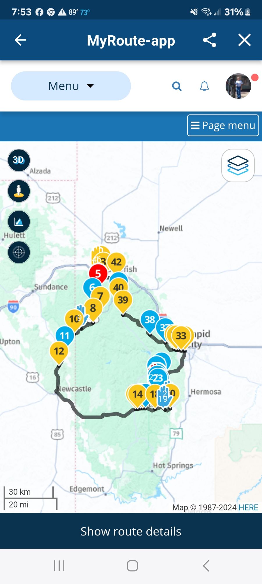Once the ride on Iron Mountain is complete, the road settles down but traffic increases as Rapid City appears on the horizon (waypoint 33 in the first picture) then it’s back on the super slab (Interstate 90) to complete the loop back to our house in Spearfish.