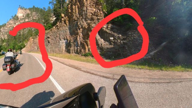 One last thing that I forgot to include. Mason is running an Insta 360 camera on his handlebars. He was able to capture a really great image of some wildlife in Spearfish Canyon. I wanted to include this picture which really should go with yesterday’s blog. This one is a quiz for you. How many old goats do you see in the picture below? (Hint: they are circled in red.) This was captured on Mason’s camera at 45 MPH or so. We are not sponsored by Insta360 but if they would like to send us some camera gear, we’ll put it to good use.