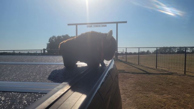 It was time to head for Sulphur to see if we could find Cross Timbers Bison Ranch. I had contacted them advising that we would be there in a black pickup truck. We meant no harm – just to take some pictures of our favorite bison – Big Joe (you’ll have to watch “Cross Timbers Bison” videos to understand who that is). My timing was really bad. I was trying to take cell phone pictures of some bison lounging in the pasture but my camera was pointed directly at the sun. I couldn’t even see what I was taking pictures of. I did manage to get a picture of one bison who appeared to have escaped the confines.
