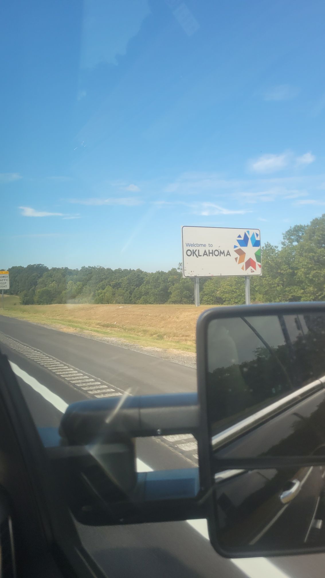 The weather man said to expect rain in Springfield this morning. For once, he was right. We drove in rain continuously until we hit the Oklahoma border. You can see from the pic below that the Sooner State welcomed us with bright sunshine and blue skies.