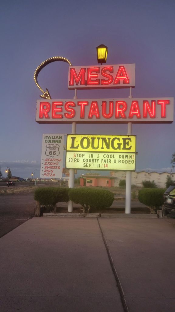 It was only 35 miles to Holbrook but it seemed like a lot more. Tonight I had reserved a spot in a Best Western. The young man behind the desk was extremely nice and when asked about a good spot for dinner, told us about a spot within walking distance I thought he deserved a raise. I’ll tell Best Western that if they ask me. We unloaded the truck again and after a quick change of clothes, we headed the block and a half to The Mesa. It is an Italian restaurant and lounge and looked like the perfect spot to me.