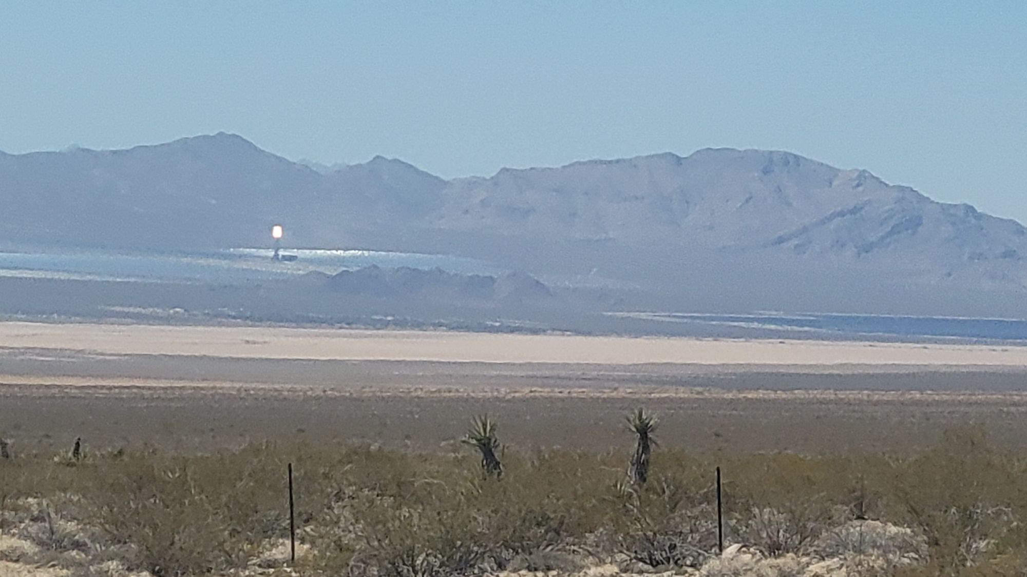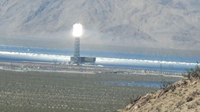 In the far right picture above, you can see a white “light” shining in the distance. Near Searchlight, California is the Ivanpah Solar Electric Generating System. It is 170.000 mirrors focusing the sunlight on 3 huge solar arrays. According to Google, it produces 377 megawatts of power – about the same as a medium sized fossil fuel power plant.