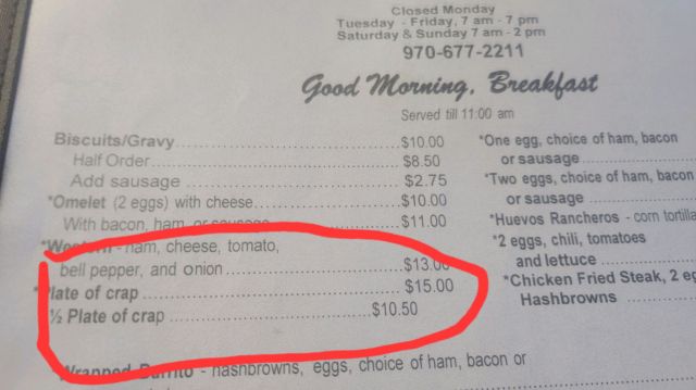 One thing you should know about breakfast at the Bell. Most restaurants call them breakfast bowls or skillets. At the Bell it is known as “Plate of Crap”.